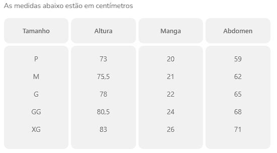 - Camiseta 100% algodão, malha 30.1 fio penteado e gola canelada 2x1 com 3cm de altura.
